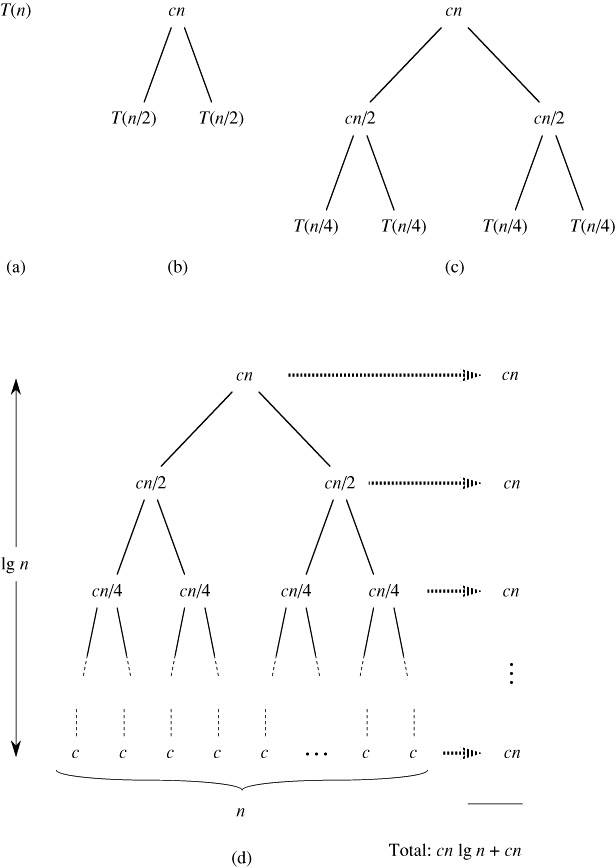 Figure 2.5 shows how we can solve the recurrence (2.2). For convenience, we assume that n is an exact power of 2. Part (a) of the figure shows T (n), which in part (b) has been expanded into an equivalent tree representing the recurrence. The cn term is the root (the cost at the top level of recursion), and the two subtrees of the root are the two smaller recurrences T (n/2). Part (c) shows this process carried one step further by expanding T (n/2). The cost for each of the two subnodes at the second level of recursion is cn/2. We continue expanding each node in the tree by breaking it into its constituent parts as determined by the recurrence, until the problem sizes get down to 1, each with a cost of c. Part (d) shows the resulting tree.