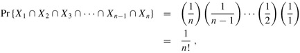 Proof We start by considering the particular permutation in which each element A[i] receives the ith smallest priority. We shall show that this permutation occurs with probability exactly 1/n!. For i = 1, 2, ..., n, let Xi be the event that element A[i] receives the ith smallest priority. Then we wish to compute the probability that for all i, event Xi occurs, which is