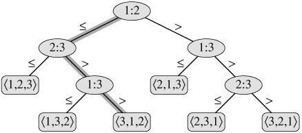 Comparison sorts can be viewed abstractly in terms of decision trees. A decision tree is a full binary tree that represents the comparisons between elements that are performed by a particular sorting algorithm operating on an input of a given size. Control, data movement, and all other aspects of the algorithm are ignored. Figure 8.1 shows the decision tree corresponding to the insertion sort algorithm from Section 2.1 operating on an input sequence of three elements.
