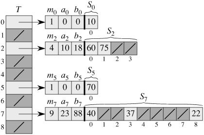 The basic idea to create a perfect hashing scheme is simple. We use a two-level hashing scheme with universal hashing at each level. Figure 11.6 illustrates the approach.