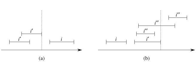 Figure 14.5: Intervals in the proof of Theorem 14.2. The value of max[left[x]] is shown in each case as a dashed line. (a) The search goes right. No interval i' in x's left subtree can overlap i. (b) The search goes left. The left subtree of x contains an interval that overlaps i (situation not shown), or there is an interval i' in x's left subtree such that high[i'] = max[left[x]]. Since i does not overlap i', neither does it overlap any interval i" in x's right subtree, since low[i'] ≤ low[i"].