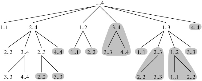 Figure 15.5 shows the recursion tree produced by the call RECURSIVE-MATRIX-CHAIN(p, 1, 4). Each node is labeled by the values of the parameters i and j. Observe that some pairs of values occur many times.