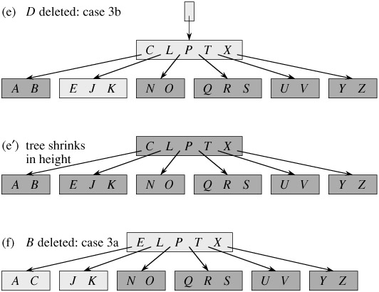 We sketch how deletion works instead of presenting the pseudocode. Figure 18.8 illustrates the various cases of deleting keys from a B-tree.