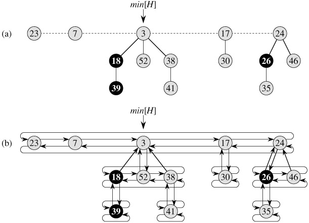 Unlike trees within binomial heaps, which are ordered, trees within Fibonacci heaps are rooted but unordered. As Figure 20.1(b) shows, each node x contains a pointer p[x] to its parent and a pointer child[x] to any one of its children. The children of x are linked together in a circular, doubly linked list, which we call the child list of x. Each child y in a child list has pointers left[y] and right[y] that point to y's left and right siblings, respectively. If node y is an only child, then left[y] = right[y] = y. The order in which siblings appear in a child list is arbitrary.
