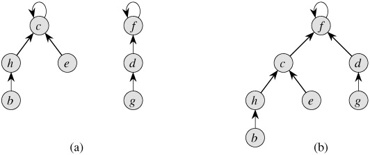 We perform the three disjoint-set operations as follows. A MAKE-SET operation simply creates a tree with just one node. We perform a FIND-SET operation by following parent pointers until we find the root of the tree. The nodes visited on this path toward the root constitute the find path. A UNION operation, shown in Figure 21.4(b), causes the root of one tree to point to the root of the other.