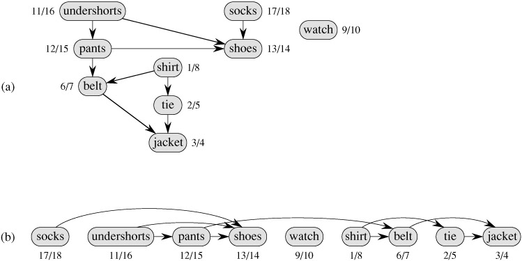 Directed acyclic graphs are used in many applications to indicate precedences among events. Figure 22.7 gives an example that arises when Professor Bumstead gets dressed in the morning. The professor must don certain garments before others (e.g., socks before shoes). Other items may be put on in any order (e.g., socks and pants). A directed edge (u, v) in the dag of Figure 22.7(a) indicates that garment u must be donned before garment v. A topological sort of this dag therefore gives an order for getting dressed. Figure 22.7(b) shows the topologically sorted dag as an ordering of vertices along a horizontal line such that all directed edges go from left to right.