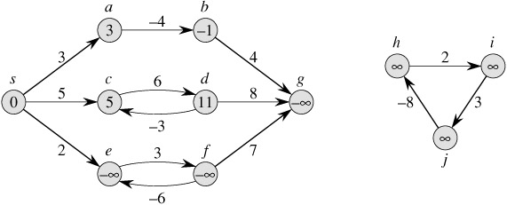 Figure 24.1 illustrates the effect of negative weights and negative-weight cycles on shortest-path weights. Because there is only one path from s to a (the path 〈s, a〉), δ(s, a) = w(s, a) = 3. Similarly, there is only one path from s to b, and so δ(s, b) = w(s, a) + w(a, b) = 3 + (-4) = -1. There are infinitely many paths from s to c: 〈s, c〉, 〈s, c, d, c〉, 〈s, c, d, c, d, c〉, and so on. Because the cycle 〈c, d, c〉 has weight 6 + (-3) = 3 > 0, the shortest path from s to c is 〈s, c〉, with weight δ(s, c) = 5. Similarly, the shortest path from s to d is 〈s, c, d〉, with weight δ(s, d) = w(s, c) + w(c, d) = 11. Analogously, there are infinitely many paths from s to e: 〈s, e〉, 〈s, e, f, e〉, 〈s, e, f, e, f, e〉, and so on. Since the cycle 〈e, f, e〉 has weight 3 + (-6) = -3 < 0, however, there is no shortest path from s to e. By traversing the negative-weight cycle 〈e, f, e〉 arbitrarily many times, we can find paths from s to e with arbitrarily large negative weights, and so δ(s, e) = -∞. Similarly, δ(s, f) = -∞. Because g is reachable from f , we can also find paths with arbitrarily large negative weights from s to g, and δ(s, g) = -∞. Vertices h, i, and j also form a negative-weight cycle. They are not reachable from s, however, and so δ(s, h) = δ(s, i) = δ(s, j) = ∞.