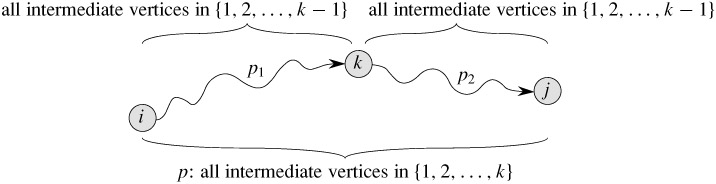 as shown in Figure 25.3. By Lemma 24.1, p1 is a shortest path from i to k with all intermediate vertices in the set {1, 2,..., k}. Because vertex k is not an intermediate vertex of path p1, we see that p1 is a shortest path from i to k with all intermediate vertices in the set {1, 2,..., k - 1}. Similarly, p2 is a shortest path from vertex k to vertex j with all intermediate vertices in the set {1, 2,..., k - 1}.