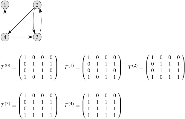 Figure 25.5 shows the matrices T(k) computed by the TRANSITIVE-CLOSURE procedure on a sample graph. The TRANSITIVE-CLOSURE procedure, like the Floyd-Warshall algorithm, runs in Θ(n3) time. On some computers, though, logical operations on single-bit values execute faster than arithmetic operations on integer words of data. Moreover, because the direct transitive-closure algorithm uses only boolean values rather than integer values, its space requirement is less than the Floyd-Warshall algorithm's by a factor corresponding to the size of a word of computer storage.