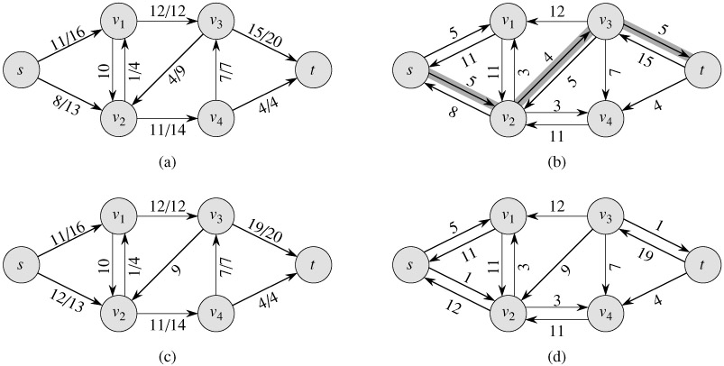 The shaded path in Figure 26.3(b) is an augmenting path. Treating the residual network Gf in the figure as a flow network, we can increase the flow through each edge of this path by up to 4 units without violating a capacity constraint, since the smallest residual capacity on this path is cf(v2, v3) = 4. We call the maximum amount by which we can increase the flow on each edge in an augmenting path p the residual capacity of p, given by