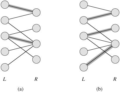 Given an undirected graph G = (V, E), a matching is a subset of edges M ⊆ E such that for all vertices v ∈ V, at most one edge of M is incident on v. We say that a vertex v ∈ V is matched by matching M if some edge in M is incident on v; otherwise, v is unmatched. A maximum matching is a matching of maximum cardinality, that is, a matching M such that for any matching M', we have |M| ≥ |M'|. In this section, we shall restrict our attention to finding maximum matchings in bipartite graphs. We assume that the vertex set can be partitioned into V = L ∪ R, where L and R are disjoint and all edges in E go between L and R. We further assume that every vertex in V has at least one incident edge. Figure 26.7 illustrates the notion of a matching.