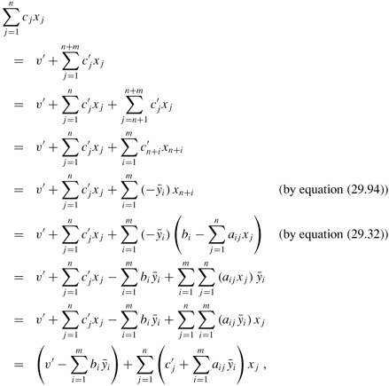 . Evaluating the dual objective function (29.89), we obtain an objective value of (30 · 0) + (24 · (1/6)) + (36 · (2/3)) = 28, which confirms that the objective value of the primal is indeed equal to the objective value of the dual. Combining these calculations with Lemma 29.8, we have a proof that the optimal objective value of the primal linear program is 28. We now show that in general, an optimal solution to the dual, and a proof of the optimality of a solution to the primal, can be obtained in this manner.