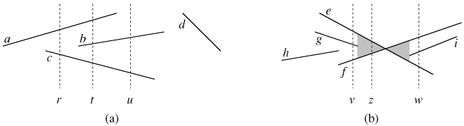 To be more precise, consider two segments s1 and s2. We say that these segments are comparable at x if the vertical sweep line with x-coordinate x intersects both of them. We say that s1 is above s2 at x, written s1 >x s2, if s1 and s2 are comparable at x and the intersection of s1 with the sweep line at x is higher than the intersection of s2 with the same sweep line. In Figure 33.4(a), for example, we have the relationships a >r c, a >t b, b >t c, a >t c, and b >u c. Segment d is not comparable with any other segment.