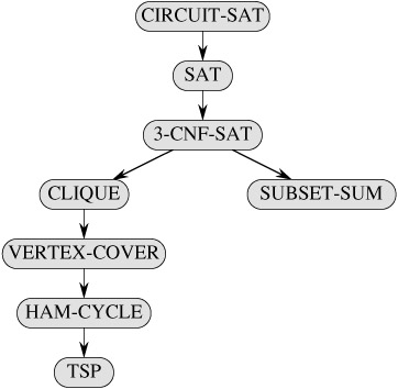 Figure 34.13 outlines the structure of the NP-completeness proofs in this section and Section 34.4. Each language in the figure is proved NP-complete by reduction from the language that points to it. At the root is CIRCUIT-SAT, which we proved NP-complete in Theorem 34.7.