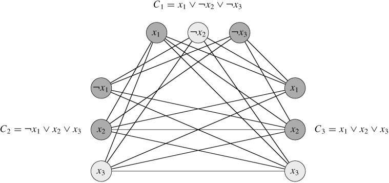 In the example of Figure 34.14, a satisfying assignment of φ has x2 = 0 and x3 = 1. A corresponding clique of size k = 3 consists of the vertices corresponding to ¬x2 from the first clause, x3 from the second clause, and x3 from the third clause. Because the clique contains no vertices corresponding to either x1 or ¬x1, we can set x1 to either 0 or 1 in this satisfying assignment.