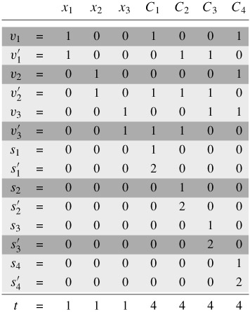 together sum to at most 3. If S' includes a vi that has a 1 in that position, then the literal xi appears in clause Cj. Since we have set xi = 1 when vi ∈ S', clause Cj is satisfied. If S' includes a