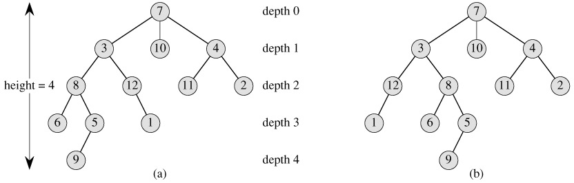 A binary tree is not simply an ordered tree in which each node has degree at most 2. For example, in a binary tree, if a node has just one child, the position of the child-whether it is the left child or the right child-matters. In an ordered tree, there is no distinguishing a sole child as being either left or right. Figure B.7(b) shows a binary tree that differs from the tree in Figure B.7(a) because of the position of one node. Considered as ordered trees, however, the two trees are identical.