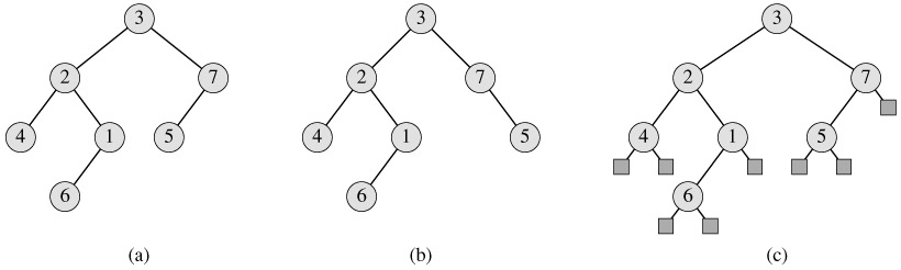 The positioning information in a binary tree can be represented by the internal nodes of an ordered tree, as shown in Figure B.7(c). The idea is to replace each missing child in the binary tree with a node having no children. These leaf nodes are drawn as squares in the figure. The tree that results is a full binary tree: each node is either a leaf or has degree exactly 2. There are no degree-1 nodes. Consequently, the order of the children of a node preserves the position information.