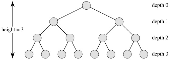 A complete k-ary tree is a k-ary tree in which all leaves have the same depth and all internal nodes have degree k. Figure B.8 shows a complete binary tree of height 3. How many leaves does a complete k-ary tree of height h have? The root has k children at depth 1, each of which has k children at depth 2, etc. Thus, the number of leaves at depth h is kh. Consequently, the height of a complete k-ary tree with n leaves is logk n. The number of internal nodes of a complete k-ary tree of height h is