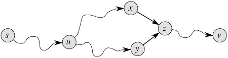Figure 15.4: A directed graph showing that the problem of finding a longest simple path in an unweighted directed graph does not have optimal substructure. The path q → r → t is a longest simple path from q to t, but the subpath q → r is not a longest simple path from q to r, nor is the subpath r → t a longest simple path from r to t.